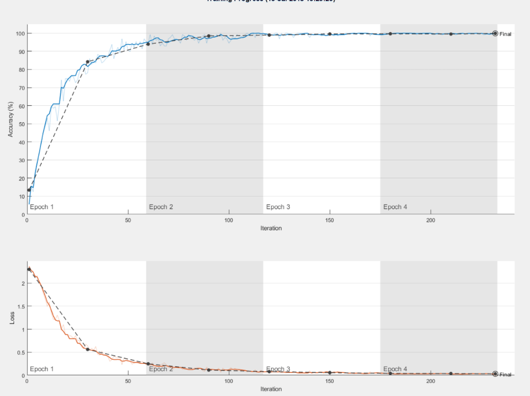 신경망 구조를 정의한 다음에는 훈련 옵션을 지정합니다. SGDM(Stochastic Gradient Descent with Momentum: 모멘텀을 사용한 확률적 경사하강법)을 사용하여 초기 학습률 0.01로 신경망을 훈련시킵니다. 최대 Epoch 횟수를 4로 설정합니다. Epoch 1회는 전체 훈련 데이터 세트에 대한 하나의 완전한 훈련 주기를 의미합니다. 검증 데이터와 검증 빈도를 지정하여 훈련 중에 신경망 정확도를 모니터링합니다. 매 Epoch마다 데이터를 섞습니다. 훈련 데이터에 대해 신경망이 훈련되고, 훈련 중에 규칙적인 간격으로 검증 데이터에 대한 정확도가 계산됩니다. 검증 데이터는 신경망 가중치를 업데이트하는 데 사용되지 않습니다. 훈련 진행 상황 플롯을 켜고 명령 창 출력을 끕니다.